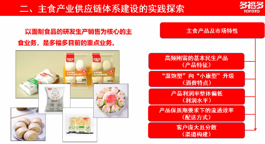 结合企业运营实践,介绍了多福多以科技创新为支撑,通过主食产业供应链体系构建及优化,促进企业提质增效方面的经验和成果。