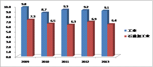 从更长的时间来看,2009年以来,石油加工行业的物流成本水平总体上呈现下降趋势,相对于2009年的7.3%,2013年物流费用率下降了0.9个百分点。