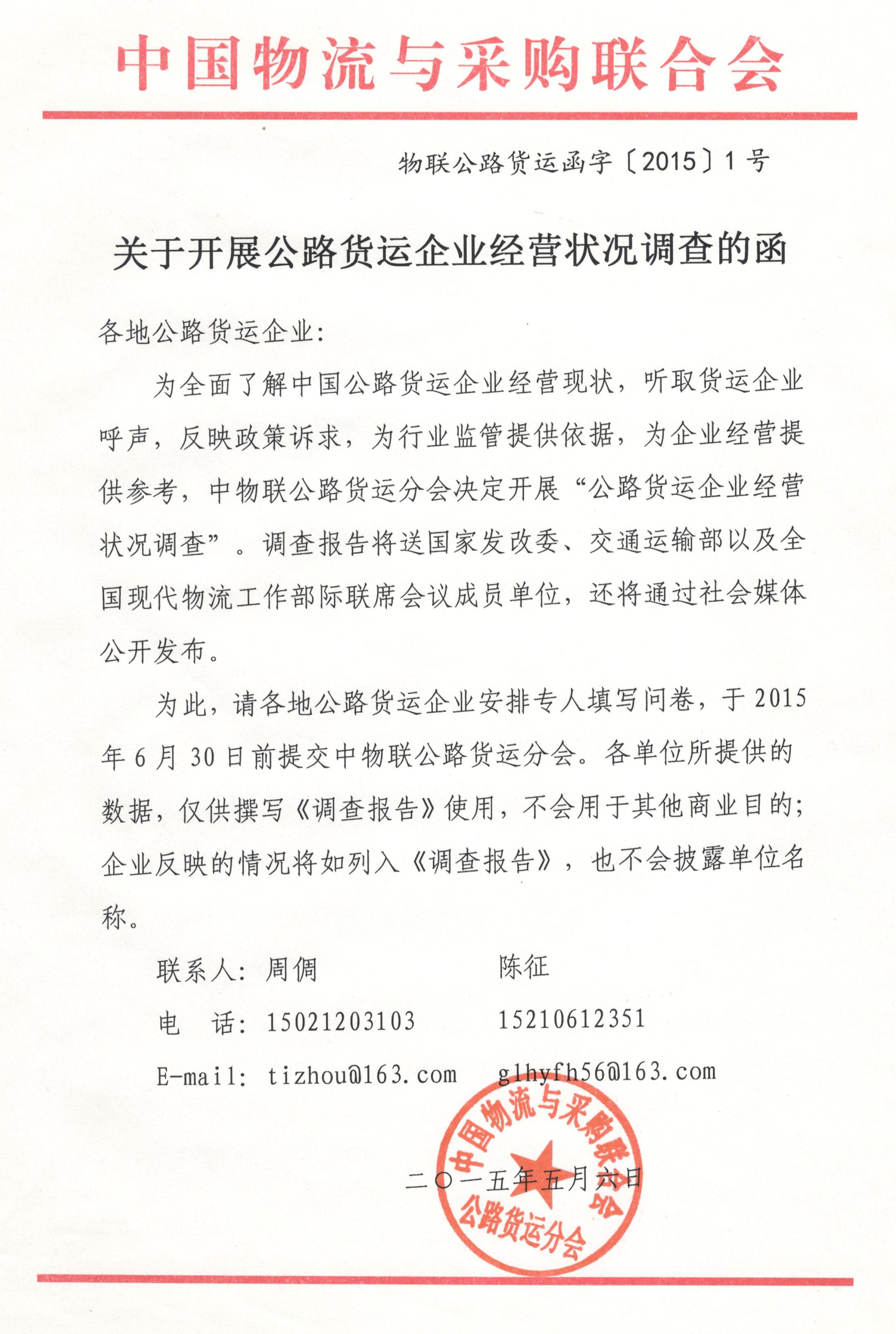 为此,请各地公路货运企业安排专人填写问卷,于2015年6月30日前提交中物联公路货运分会。各单位所提供的数据,仅供撰写《调查报告》使用,不会用于其他商业目的;企业反映的情况将如列入《调查报告》,也不会披露单位名称。
