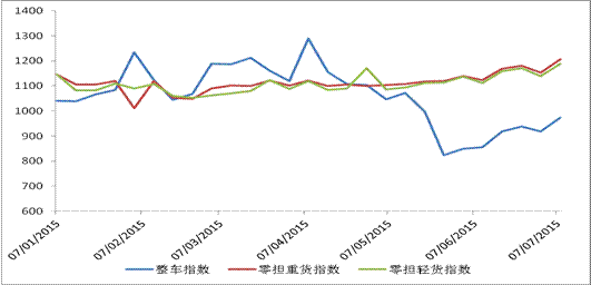 从分车型指数看,各车型指数环比均有所回升。整车指数为972.9点,比上周回升5.8%,比年初下降5.1%,但比5月末回升18.1%;零担轻货为1187.9点,比上周回升4.3%,比年初回升7.4%,比5月末回升6.7%;零担重货为1205.7点,比上周回升4.6%,比年初回升8.6%,比5月末回升7.7%。