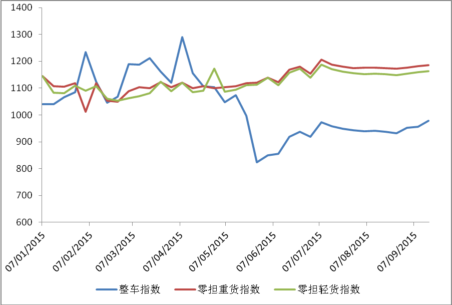 分车型指数环比均有所回升,整车指数涨幅明显高于零担指数。整车指数为977.7点,比上周回升2.2%,比年初回落4.7%;零担轻货指数为1163.0点,比上周回升0.4%,比年初回升4.4%;零担重货指数为1185.1点,比上周回升0.3%,比年初回升5.8%。