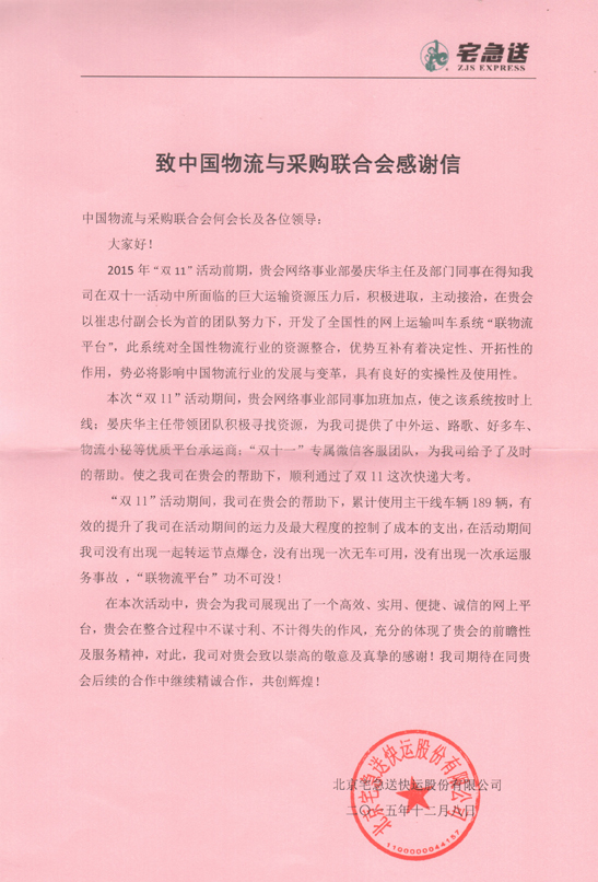 宅急送在感谢信中表示,宅急送在“联物流平台”的帮助下,累计使用主干车辆189辆,有效的提升了宅急送在双十一期间的运力及最大程度的控制了其成本支出,在双十一期间,没有出现一起转运节点爆仓,没有出现一次无车可用及承运服务事故。