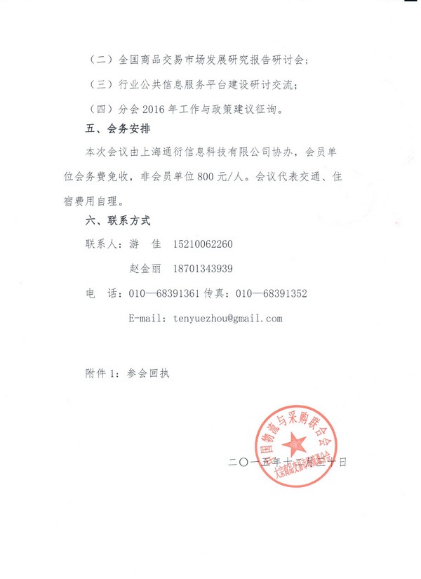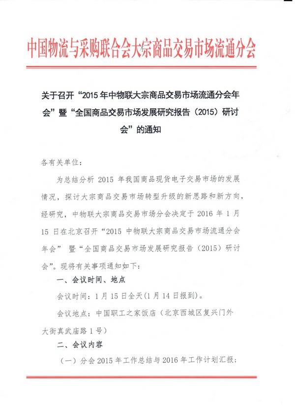 关于召开“2015年中物联大宗商品交易市场流通分会年会”暨“全国商品交易市场发展研究报告(2015)研讨会”的通知