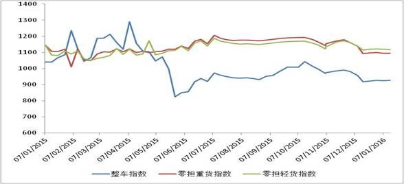 各车型指数环比呈现涨跌互现态势,其中整车指数环比回升,但明显低于上年同期水平;零担指数则环比回落,零担轻货指数降幅低于零担重货指数。本周,整车指数为926.0点,比上周回升0.17%,但同比回落10.9%;零担轻货指数为1117.4点,比上周回落0.2%,同比回升3.2%;零担重货指数为1093.6点,比上周回落0.12%,同比回落1.2%。