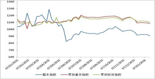 各车型指数环比均有所回落,其中整车指数明显高于零担指数;零担指数降幅高于零担重货指数。本周,整车指数为906.2点,比上周回落2.1%,同比回落15.0%;零担轻货指数为1101.9点,比上周回落1.4%,但同比回升1.9%;零担重货指数为1082.0点,比上周回落1.05%,同比回落1.5%。