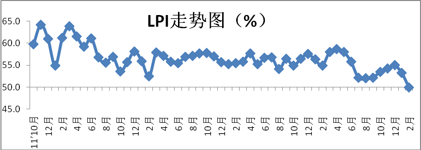 物流服务价格回升,市场短时供需不平。2月份,物流服务价格指数环比回升4个百分点,位于51.7%。反映出从业人员减少,用工成本增长,市场需求不减,作为与民生有关服务产业的物流业,在本月出现供小于求的现象,导致物流服务价格较上月回升。