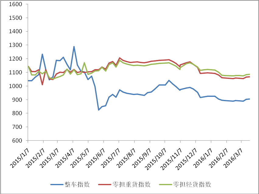 各车型指数环比均有所回升,其中整车指数环比回升幅度零担指数,零担重货指数回升幅度则高于零担轻货指数。本周,整车指数为904.8点,比上周回升0.24%,但仍比年初回落2.2%;零担重货指数为1068.2点,比上周回升0.19%,同比则回落4.8%;零担轻货指数为1086.0点,比上周回升0.11%,同比则回落3.3%。