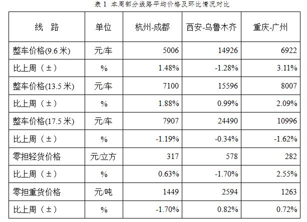 本周,货物运输运行总体平稳,公路物流需求较前期稳步回升,特别是受到前期大宗商品价格回暖等因素影响,整车物流需求增长明显;在此背景下,公路物流价格连续两周回升,但回升幅度有所放缓。从后期走势看,随着供给侧改革利好释放,经济运行将逐渐恢复平稳,公路物流需求有望企稳回升,预计未来公路物流运价指数环比可能呈现震荡回升的走势。