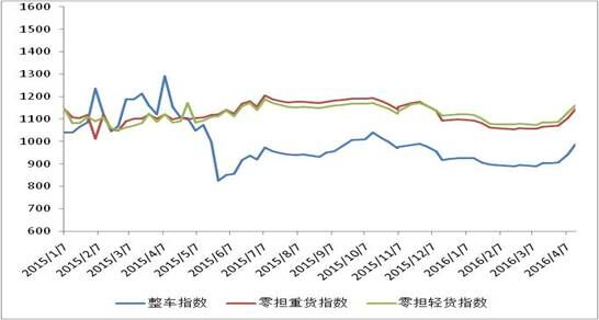 各车型指数环比均有所回升,其中整车指数环比回升幅度高于零担指数,零担重货指数回升幅度则高于零担轻货指数。本周,整车指数为988.7点,环比回升4.8%,比年初回升6.8%,但比上年同期回落14.4%;零担重货指数为1145.9点,环比回升3.9%,同比回升4.2%;零担轻货指数为1163.3点,环比回升3.1%,同比回升7.3%。