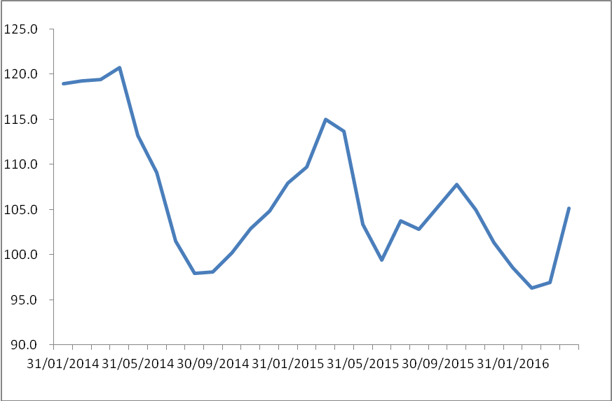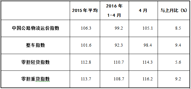 和林安物流集团联合调查的中国公路物流运价指数2016年4月为105.1点,比上月回升8.5%,但仍比上年同期下降7.5%。