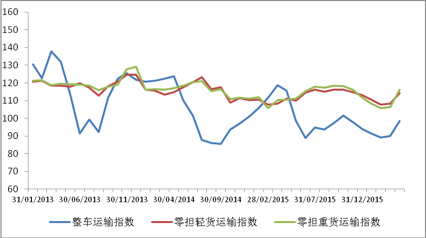 从分车型指数看,整车指数为98.4点,比上月回升9.4%,但比上年同期下降14.8%。零担轻货指数为114.3点,比上月回升5.6%,比上年同期增长2.9%;零担重货指数为116.2点,比上月回升9.2%,比上年同期增长5.1%。