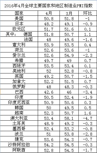 2016年4月全球主要国家和地区制造业PMI指数