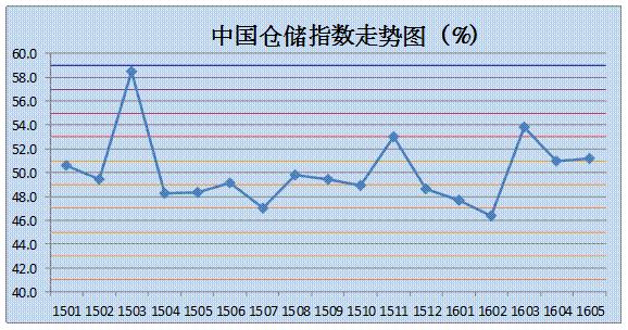 与中储发展股份有限公司联合调查的2016年5月中国仓储指数为51.2%,较上月回升0.2个百分点,连续三个月位于扩张区间。各分项指数中,业务活动预期指数、期末库存指数、企业员工指数、业务成本指数等均有不同程度回升,其中业务活动预期指数涨幅超过10个百分点。新订单指数、业务量指数、业务利润指数等呈回落走势。收费价格指数与上月持平。
