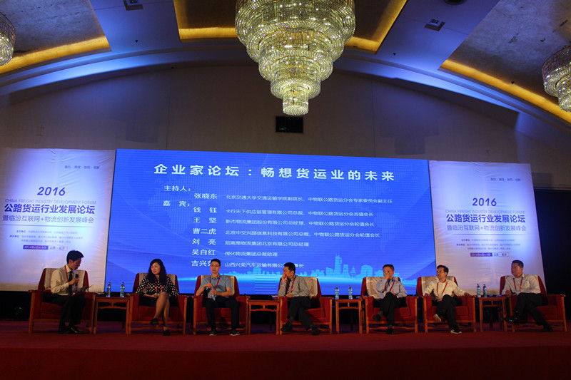 在张晓东主持的企业家论坛上,6位企业家畅想货运业未来。他们是,卡行天下供应链管理有限公司总裁、中物联公路货运分会当值会长钱钰,新杰物流集团股份有限公司总经理、中物联公路货运分会轮值会长王坚,北京中交兴路信息科技有限公司总裁、中物联公路货运分会轮值会长曹二虎,招商局物流集团北京有限公司总经理刘亮,传化物流集团总裁助理吴自红、山西兴荣汽车运输有限公司董事长吉兴荣。