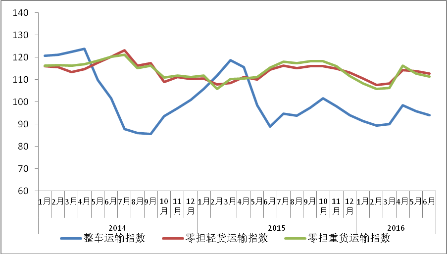 从分车型指数看,6月整车指数为94.1点,比上月回落1.8%,但比上年同期增长5.7%;零担轻货指数为112.7点,比上月回落1.1%,比上年同期下降1.5%;零担重货指数为111.3点,比上月回落1.3%,比上年同期下降3.4%。