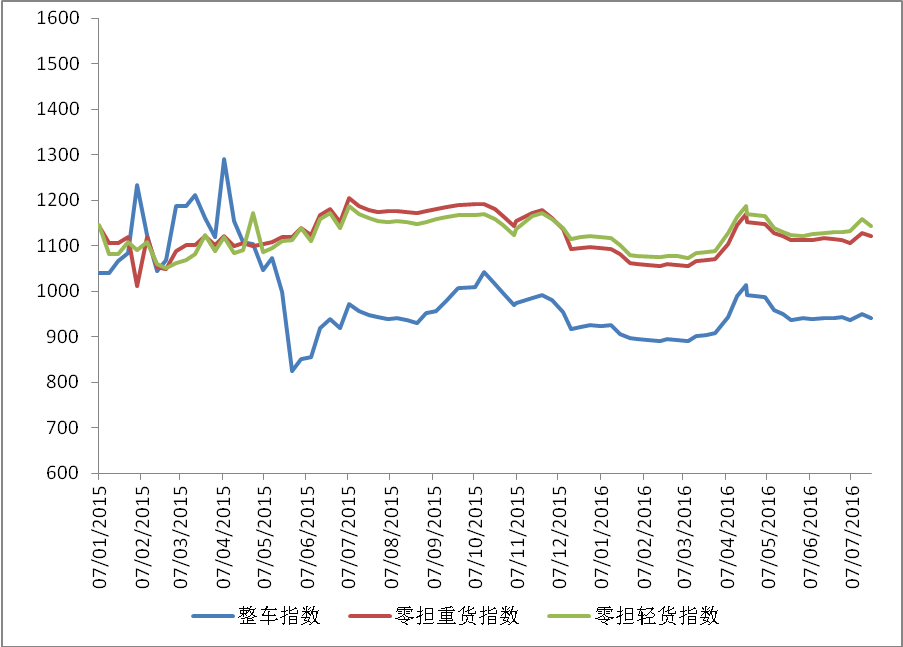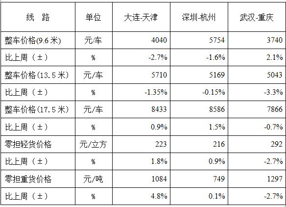各车型指数均有所回落,其中零担轻货指数回落幅度高于整车指数,零担重货指数回落幅度相对较低。本周,整车指数为940.7点,环比回落1.0%,比年初回升1.6%,但比上年同期下降0.9%;零担重货指数为1121.3点,环比回落0.6%,比上年同期下降4.9%;零担轻货指数为1143.9点,环比回落1.4%,比上年同期下降1.5%。