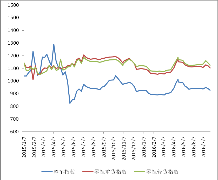 各车型指数环比均有所回落,其中零担指数回落幅度高于整车指数,零担轻货指数回落幅度高于零担重货指数。本周,整车指数为926.1点,环比回落1.6%,比上年同期下降1.8%;零担重货指数为1102.6点,环比回落1.7%,比上年同期下降6.0%;零担轻货指数为1123.9点,环比回落1.8%,比上年同期下降2.7%。