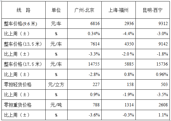 本周,公路物流需求较前期未见明显改善,公路物流价格指数连续两周环比回落,且回落幅度有所扩大。从后期走势看,公路物流需求总体仍将较为平缓,预计未来两周公路物流运价指数总体将延续震荡走势。