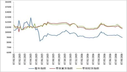 各车型指数环比有不同程度回落,其中整车指数回落幅度高于零担指数,零担重货指数回落幅度高于零担轻货指数。本周,整车指数为897.9点,环比回落1.5%,比上年同期下降4.7%;零担重货指数为1072.4点,环比回落1.4%,比上年同期下降8.9%;零担轻货指数为1093.4点,环比回落0.7%,比上年同期下降5.3%。