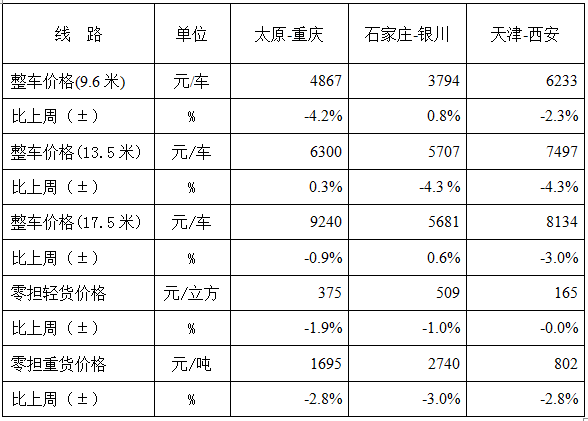 从分地区指数来看,各地区运价指数环比有不同程度回落。其中,华北及西北地区运价指数环比回落幅度较高,比上周回落1.5%左右;珠三角及东部沿海地区运价指数回落幅度则在1.0%左右。