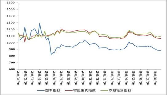 各车型指数涨跌不一,其中整车指数、零担轻货指数环比回升,零担轻货指数环比回落。本周,整车指数为885.6点,环比回升0.01%,但比上年同期下降7.0%;零担重货指数为1063.5点,环比回落0.12%,比上年同期下降9.6%;零担轻货指数为1094.8点,环比回升0.4%,但比上年同期下降5.1%。