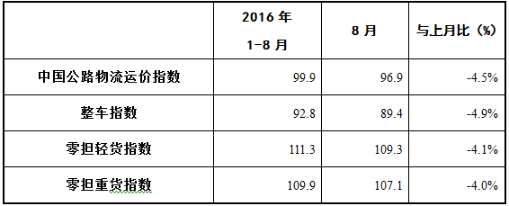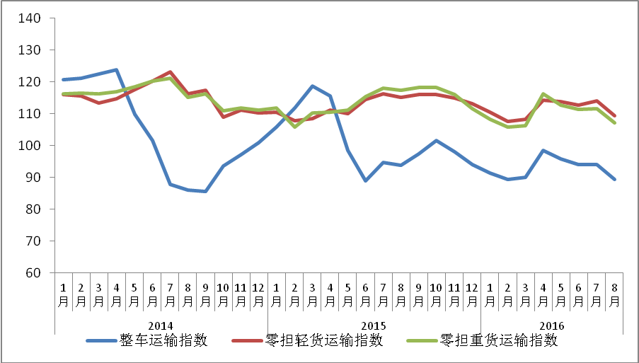进入8月,公路物流需求总体稳中趋缓。一方面,工业生产增长基本平稳,其中传统和产能过剩的采矿、高耗能等行业增速继续回落,在此背景下,8月整车指数继续回落,为89.4点,比上月回落4.9%,比上年同期下降4.7%;另一方面,高技术类和消费品物流需求仍保持较快增长,但增速较前期小幅回落,受此影响零担指数也有所回落,8月零担轻货指数为109.3点,比上月回落4.1%;零担重货指数为107.1点,比上月回落4.0%。