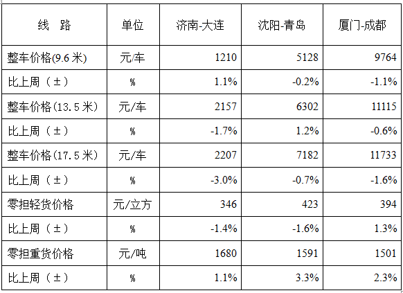 各车型指数涨跌互现,其中整车指数环比回落,零担指数则环比回升,在零担指数中零担轻货指数回升幅度高于零担重货指数。本周,整车指数为903.7点,环比回落1.3%,比上年同期下降10.3%;零担重货指数为1104.8点,环比回升0.8%,比上年同期下降7.1%;零担轻货指数为1142.0点,环比回升1.0%,但比上年同期下降2.2%。