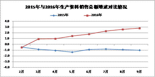 三季度,随着供给侧改革政策措施不断落实,经济运行积极变化明显:生产资料市场需求好转;市场价格连续回升,9月份同比时隔57个月由负转正;社会库存周转加快;企业成本下降、利润增长。整体来看,三季度生产资料市场运行良好,但由于目前宏观经济下行压力依然存在,生产资料市场仍处于产能过剩的大背景下,需求增长速度不会出现明显上升,预计今年生产资料市场价格回升幅度有限。