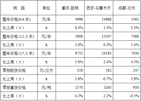 从分地区指数来看,各地区运价指数均有不同程度回升。其中, 西南、西北地区运价指数回升幅度相对较高,比上周回升2.5%左右;珠三角及东部沿海地区运价指数回升幅度相对较低,比上周回升2.0%左右。