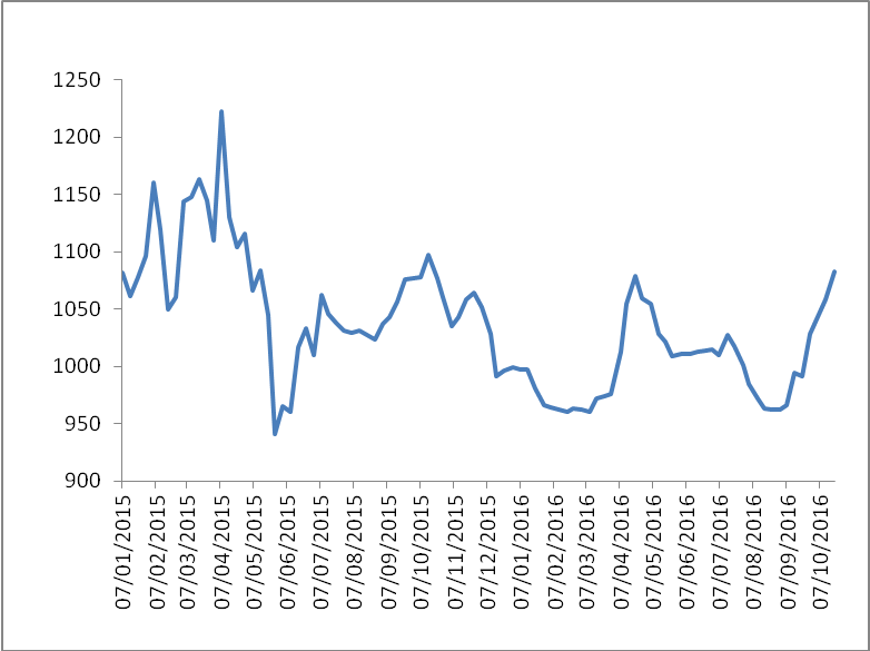 图 1 2015-2016年各周中国公路物流运价指数