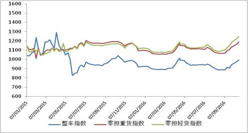 各车型指数环比均有不同程度回升,其中整车指数、零担重货运输指数环比回升幅度高于零担轻货指数。本周,整车指数为993.4点,环比回升2.3%,比年初回升7.3%;零担轻货指数为1245.7点,环比回升2.1%;零担重货指数为1189.0点,环比回升2.4%。