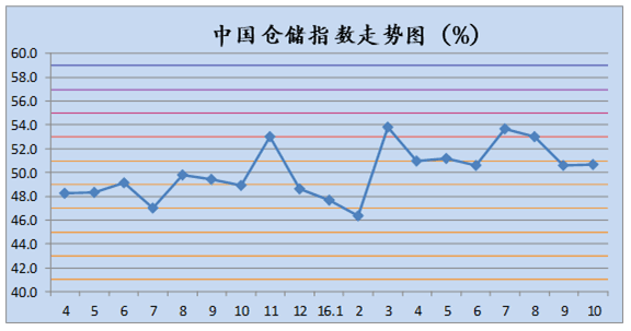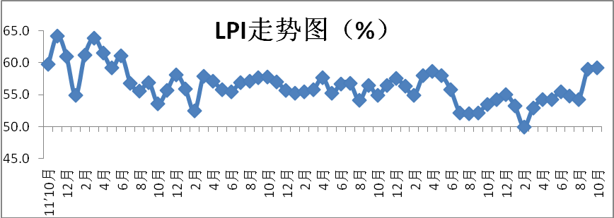 平均库存量指数回升,库存周转指数回落。10月份,平均库存量指数为57.8%,较上月回升3个百分点;库存周转次数指数为57.1%,较上月回落1.4个百分点。反映出为应对临近电商促销等活动,物流各行业增加与民生相关产品的库存,库存周转次数指数虽有所回落,但仍位于较高水平。