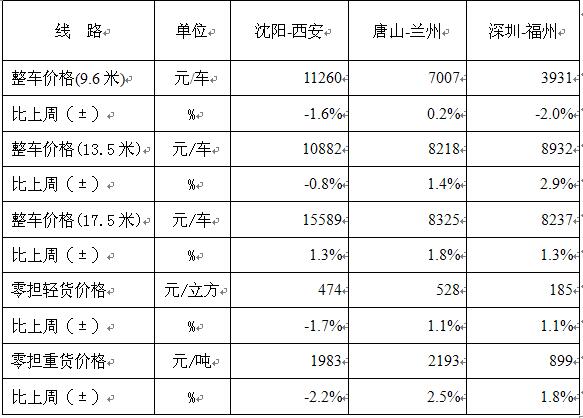 表1 本周部分线路平均价格及环比情况对比