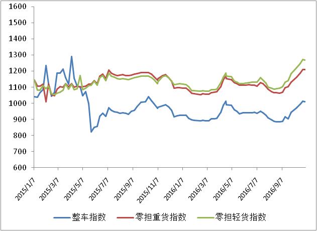 各车型指数环比均有不同程度回落,其中整车指数、零担重货运输指数环比回落幅度略高于零担轻货指数。本周,整车指数为1010.6点,环比回落0.2%,但比年初回升9.2%;零担轻货指数为1269.3点,环比回落0.1%;零担重货指数为1208.5点,环比回落0.2%。