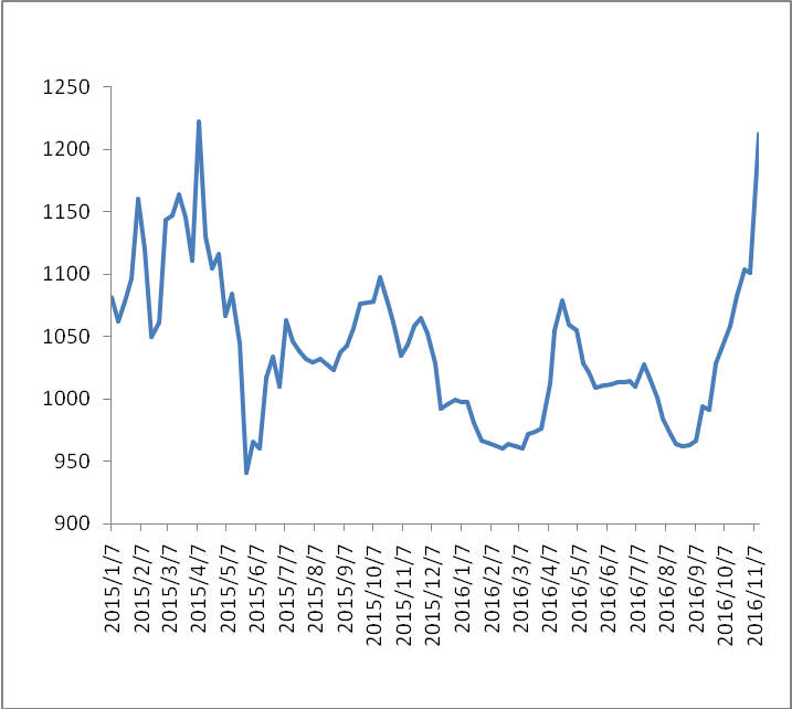 图 1 2015-2016年各周中国公路物流运价指数