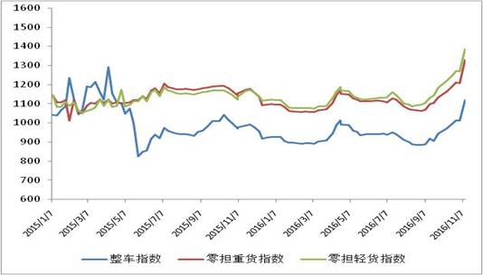 本周,随着冬季及“双十一”临近,大宗商品及快消品市场需求增长明显,厂商储备的货源也较为充足,公路物流市场需求较为旺盛,公路物流价格指数回升较为明显,达到年内较高水平。随着“双十一”电商促销活动来临,公路运输市场需求短期仍将保持较高水平,未来两周公路物流运价指数总体将延续回升走势。