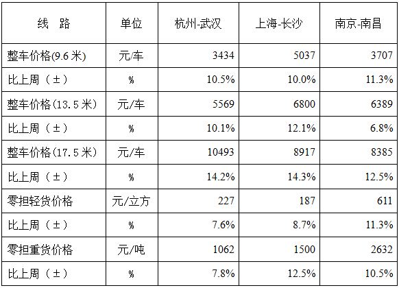表1 本周部分线路平均价格及环比情况对比