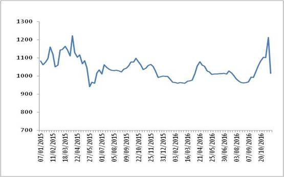 本周(2016年11月14日~11月18日),由雷竞技电竞竞猜网 和林安物流集团联合调查的中国公路物流运价指数1197.3点,在上周大幅回升后有所回调,比上周回落1.3%。