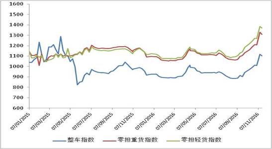 本周,受到冬季用电高峰及“双十一”电商促销等因素影响,大宗商品及快消品市场需求较前期回升较为明显。电商及各大厂商备货较早,同时多数企业根据往年经验提前签订运输合同,预订货运车辆,市场运输价格环比涨幅有所回落,但是受到治超新政等影响,近期价格仍高于上年同期水平。随着年底电商促销活动趋于频繁,消费物流需求较为旺盛,公路运输市场需求短期仍将保持较高水平,未来两周运价指数将延续回升走势。