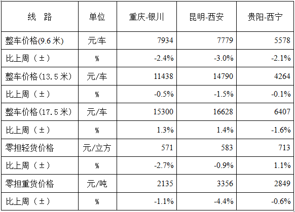 从分地区指数来看,各地区运价指数均有不同程度回落。其中, 西南及西北指数回落幅度相对较高,比上周回落1.5%左右;东北及京津冀地区运价指数回落幅度相对较低,在1.1%左右。