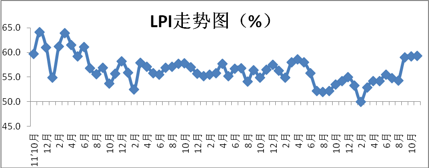 新订单指数回升,物流需求持续旺盛。11月份,新订单指数为56.6%,比上月回升0.5个百分点,该指数连续三个月位于56%以上高景气区间,显示出物流需求持续旺盛。