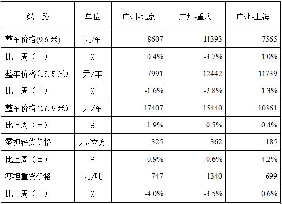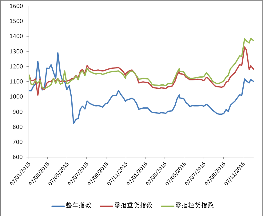 各车型指数环比均有不同程度回落,但各车型均高于上年同期水平。其中,整车指数为1101.7点,环比回落1.1%,但比上年同期增长15.3%;零担轻货指数为1371.8点,环比回落1.1%;零担重货指数为1182.6点,环比回落1.9%。