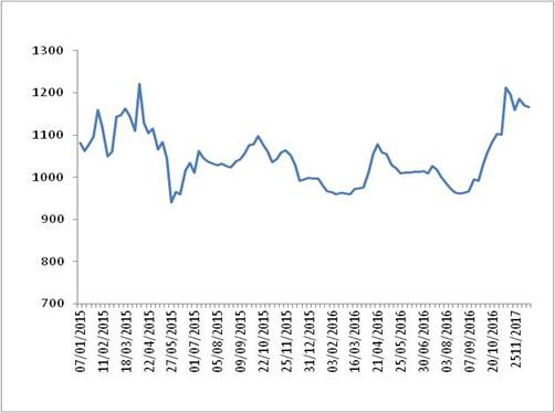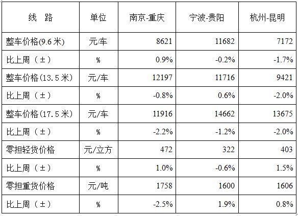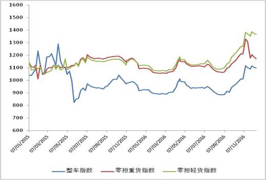 本周,公路物流市场需求总体延续了前期的平稳走势。但前期因受到治超、“双十一”等综合因素影响,价格上涨明显,波动幅度增大。近期随着需求回稳,价格指数随之有所回调,但总体仍高于上年同期水平。从后期走势看,未来公路运输市场需求有望保持平稳增长态势,运价指数可能将延续小幅回调走势。