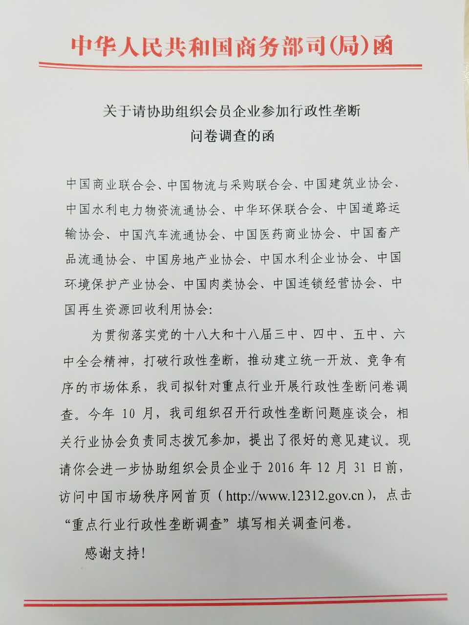 为打破物流行业行政性熔断,推动建立统一开放、竞争有序的市场体系,受商务部委托,我会协助组织会员企业参加重点行业行政性垄断问卷调查,请各单位指派专人参与调查。可上网访问中国市场秩序网首页,点击“重点行业行政性垄断调查”,网上填写相关调查问卷,或者在中国物流与采购网下载电子版问卷。请填写电子版的单位于12月31日前将问卷反馈我处。