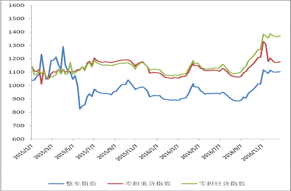 各车型指数环比均有不同程度回升,其中零担指数回升幅度高于整车指数,在零担指数中零担轻货指数回升幅度高于零担重货指数。其中,整车指数为1104.0点,环比回升0.2%,比上年同期增长19.3%;零担轻货指数为1373.1点,环比回升0.6%;零担重货指数为1176.8点,环比回升0.3%。