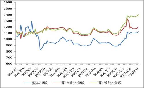 各车型指数环比均有不同程度回升,其中零担轻货指数回升幅度相对较高。其中,整车指数为1124.7点,环比回升1.7%,比上年同期增长21.5%;零担轻货指数为1400.3点,环比回升1.8%;零担重货指数为1198.7点,环比回升1.7%。