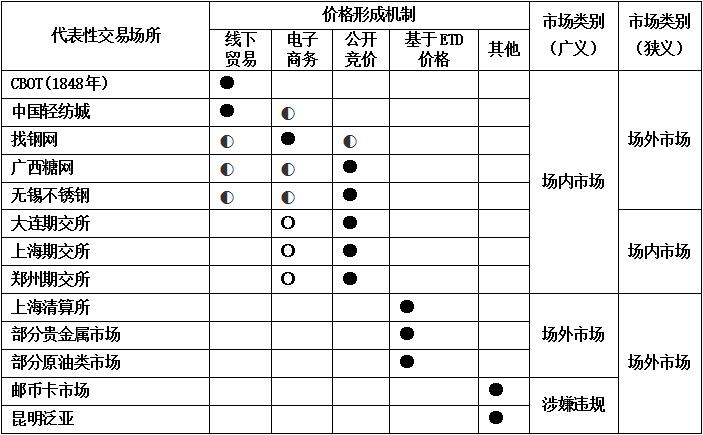 随着互联网和电子商务的快速普及,国内国际商品交易市场业态均发生了巨大的变化。目前,国内对场外市场的理解,可以总结为广义和狭义两种观点。其中,狭义的场外市场,指的是除期货交易所以外的其他交易场所。广义的场外市场,指的是商品价格不是通过公开竞价方式所形成的,而是以其他场内市场的价格为基准进行定价和交易的交易场所。概念上的混乱和观点的不一致,造成了我国市场监管主体的缺位,也导致政府的监管措施缺乏针对性,没有抓住重点。一方面,应鼓励发展的创新被抑制了,传统市场和商贸流通企业如何运用电子商务转型升级也迷失了方向,产生了困惑;另一方面,应重点加强监管的违规交易场所却反而未得到应有的惩处,风险事件频发。在当前阶段,笔者认为,我国亟待以价格形成机制作为划分依据,从广义上厘清两类市场的界限。