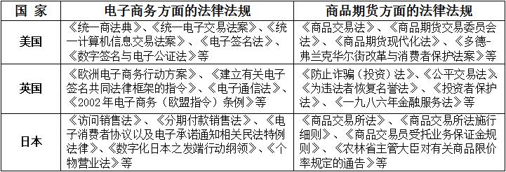 总体来看,西方国家在电子商务的法律制度方面,为促进和保障电子商务的全面发展,各国均为其营造了较为宽松的法律环境。在期货市场的法律法规和监管方面,政府机构主要是进行指导和监督,监督交易主体的行为。而在OTC市场方面,自2008年危机之后,各国普遍加强了非以交收为目的的对标准化衍生品交易的监管。总结国际市场的监管经验,凡涉及社会公共利益的交易场所,无论其交易组织形式如何,都应接受政府监管和行业自律,对其业务的合规性、公平性和公正性进行约束,以保障市场参与各方,尤其是中小投资者的合法权益不受侵害。