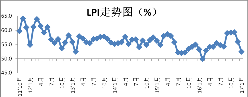 雷竞技电竞竞猜网 发布的2017年1月份中国物流业景气指数为52.5%较上月回落3.5个百分点;中国仓储指数为51%,较上月回落1.7个百分点;中国公路物流运价指数为118.8点,比上月回升1.7%。