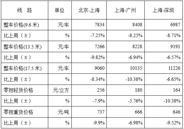 表1 本周部分线路平均价格及环比情况对比